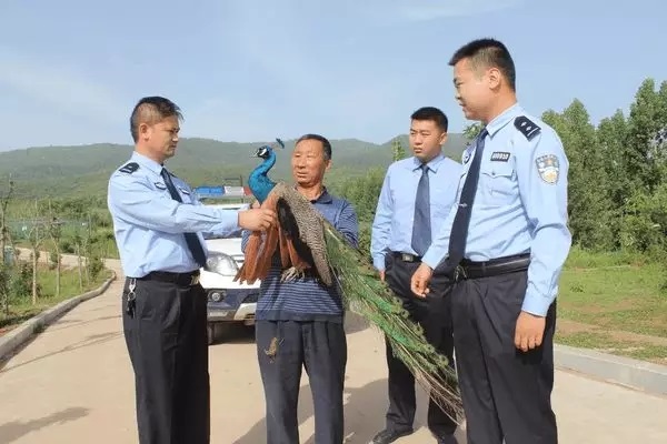 经鉴定,确认这是一只蓝孔雀,属国家三级保护动物。经仔细检查,这只蓝孔雀无明显外伤,健康状况良好,民警遂将其带回,并对当事人进行了严厉的批评教育,告知其行为的危害性。